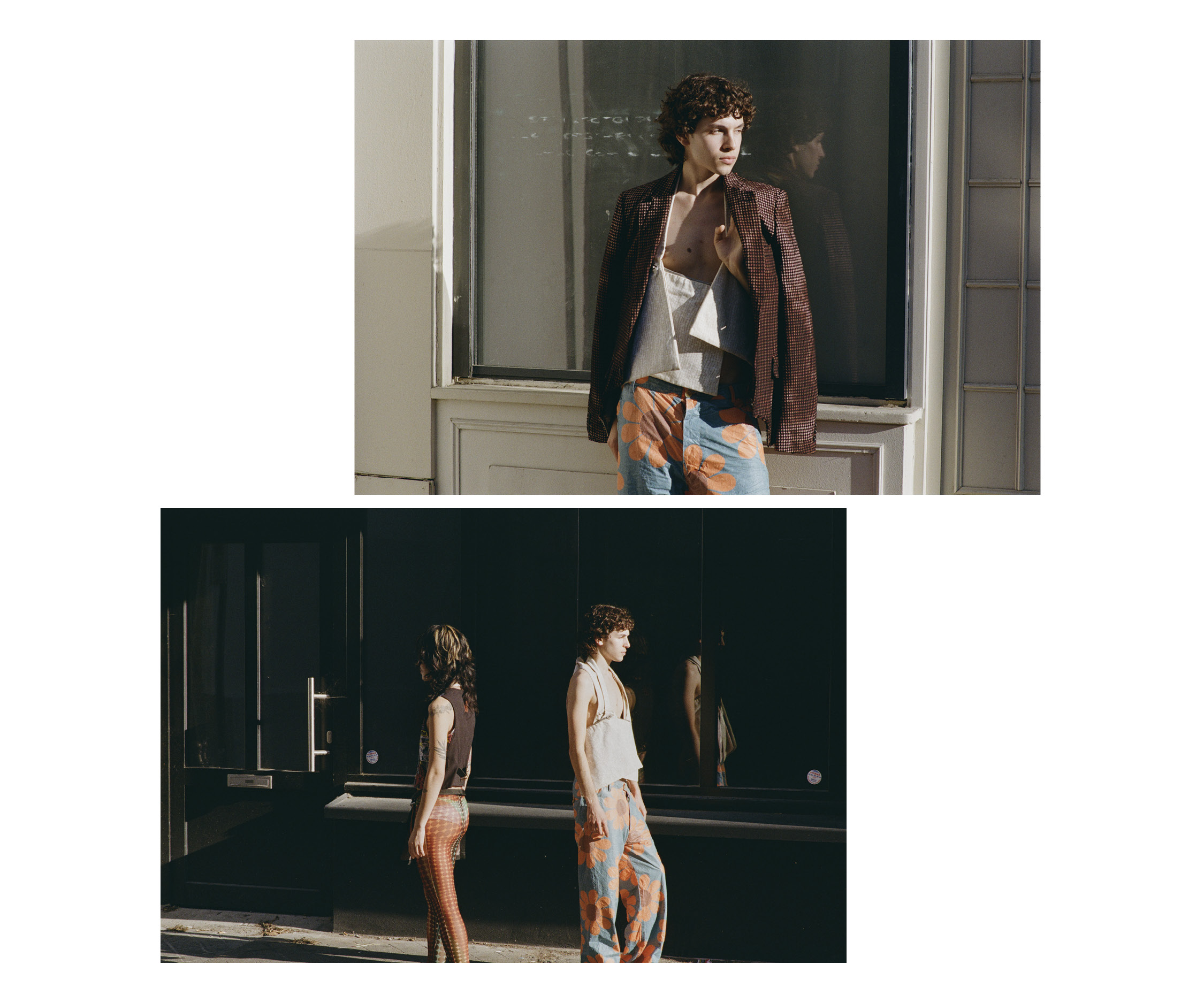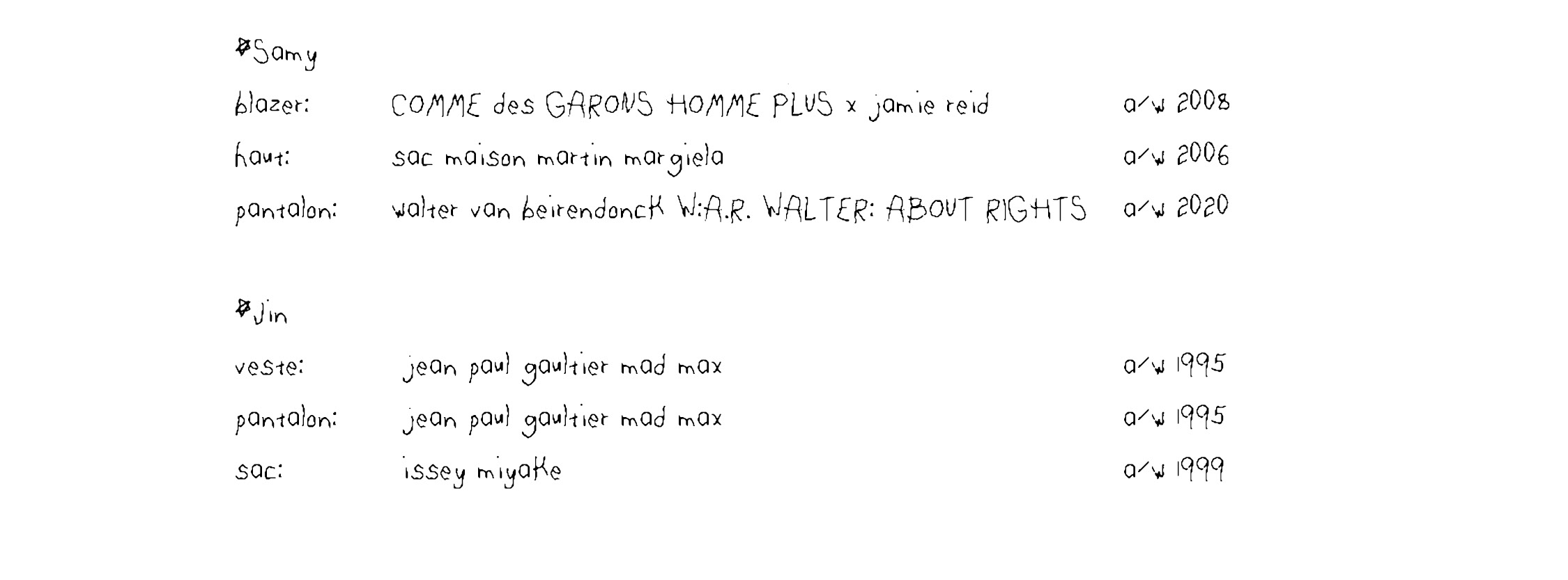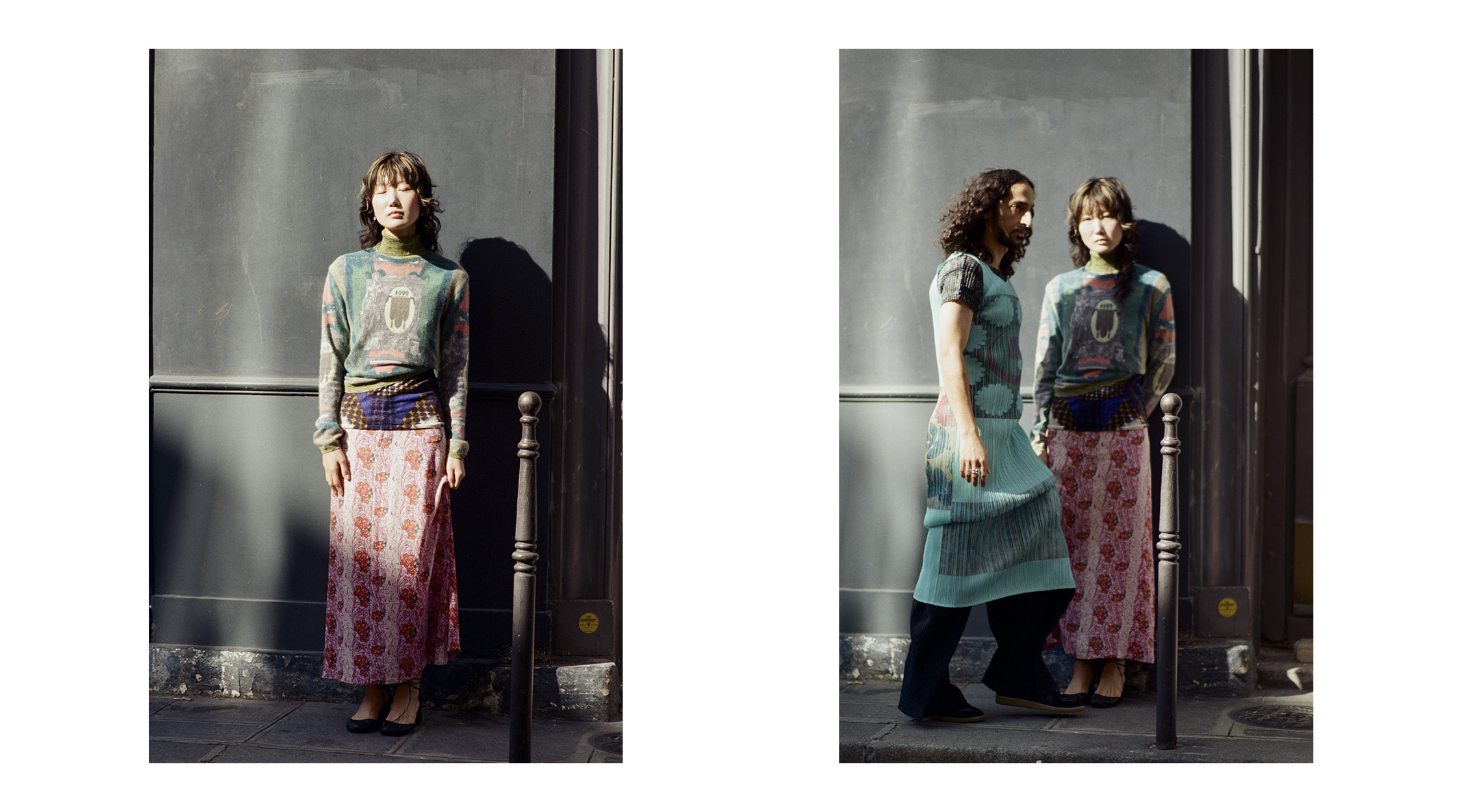 Le stylisme assemble des archives japonaises par Gaijin (Issey Miyake, Yohji Yamamoto, Comme des Garçons) avec des pièces contemporaines (Lemaire, Paloma Wool, Stone Island). Les looks sont pensés comme des compositions sculpturales : le corps tend, plie, contraint ou relâche la matière, révélant des relations inattendues entre fibres, densités et lignes.